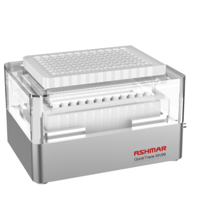 ① 萃取板,萃取樣品② 密封罩,形成密閉環(huán)境③ 孔板,收集樣品④ 負壓底座裝置,與密封罩組合,形成真空倉配置清單:系統(tǒng)主機序號 名稱 數(shù)量 名稱 數(shù)量1 試管架 1 pcs 負壓底座 1 pcs2 玻璃槽 1 pcs 廢液池 1 pcs3 密封蓋 1 pcs 密封罩 1 pcs4 兩通閥 12 pcs 墊高塊 1 pcs5 真空表 1 pcs 真空表 1 pcs6 真空泵 1 pcs 真空泵 1 pcs7 軟管 1 pcs 軟管 1 pcsQuickTrace MV96安裝流程:1、 打開包裝取出部件(部件包括,負壓底座、廢液池、墊高塊、密封蓋、軟管、真空表、真空泵);2、負壓底座放置于平穩(wěn)的桌面上;3、將廢液池放置于負壓底座內(nèi);4、將密封罩蓋在底座上;5、使用軟管連接負壓底座與真空泵;QuickTrace MV96使用流程:1、將96孔萃取板放置于裝置正上方;2、移液器向萃取板中加入液體;3、打開真空泵,液體流進廢液池;4、液體全部進入廢液池,關閉真空泵;5、將廢液池更換為96孔板,重復加液操作并收集萃取液。注意事項:A. 裝置使用的抽真空壓力不應大于0.1Mpa。B. 當系統(tǒng)達不到設定壓力時,請檢查各接頭是否擰緊,氣壓蓋密封墊是否平整,軟管是否有老化破損。C. 系統(tǒng)的負壓力一般不應超過-0.09Mpa。D. 使用時注意做好防護,小心有機試劑可能對身體造成傷害。
